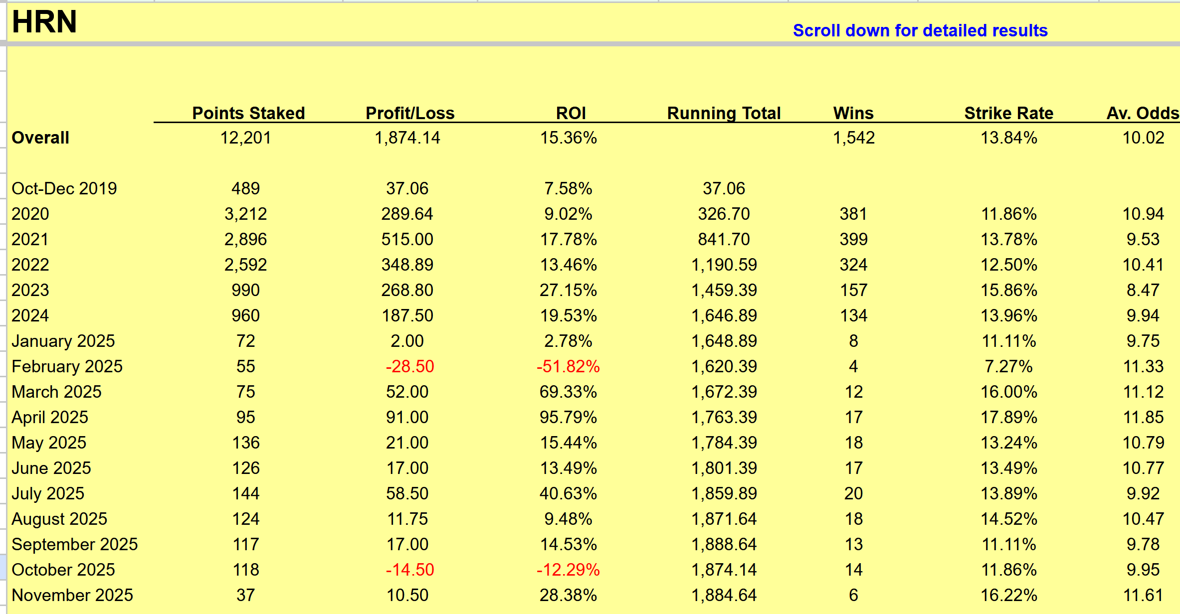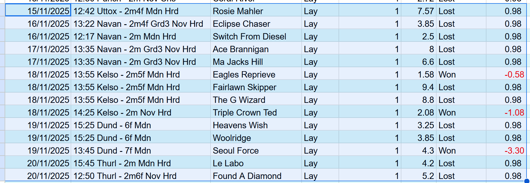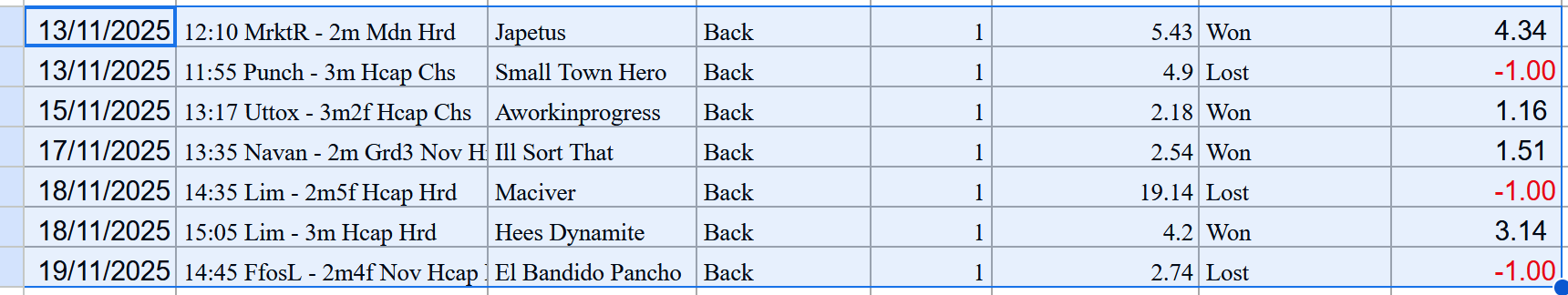 and went off 9/4 sp with non-runners, so potential R4 there. Found another winner on Thursday with KALISTA LOVE priced 13/2. Despite a pair of winners and a place he comes out of the week just under 4 points lost. Fingers crossed he can find a couple this week to turn November around - it's been a slog for sure.