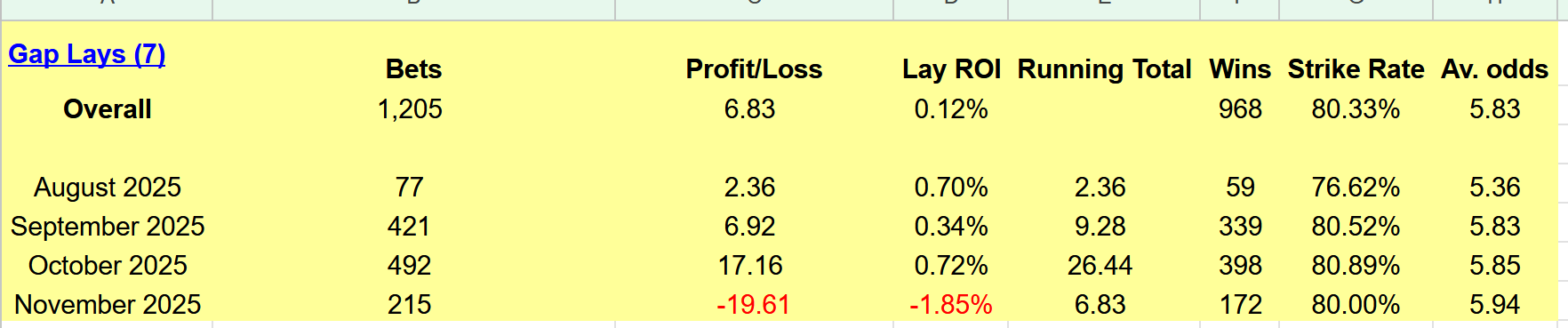 Another nice week for the Gap win bets with 4 winners from only 7 bets, and a gain of +7