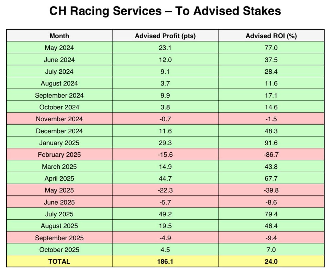 CH Racing -Selections are sent out the evening before racing — giving you plenty of time to get on at good prices. This isn’t one of those “three bets a day” guesswork services… the focus here is purely on value, not volume.