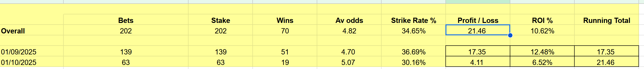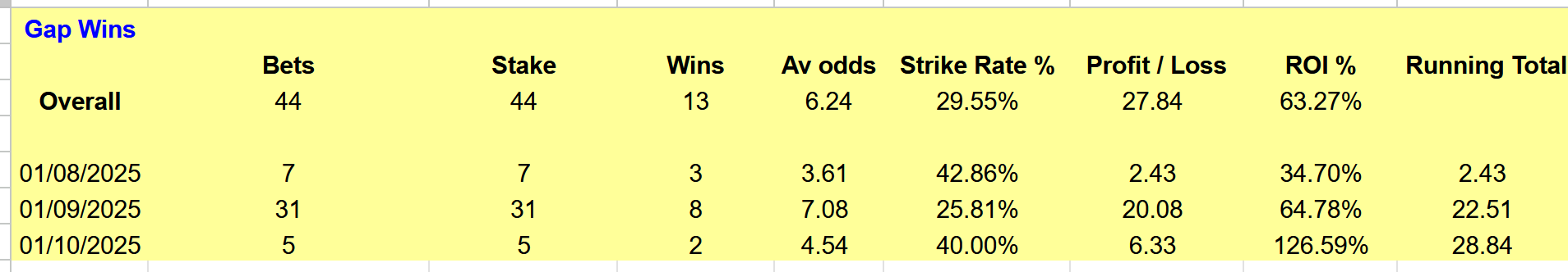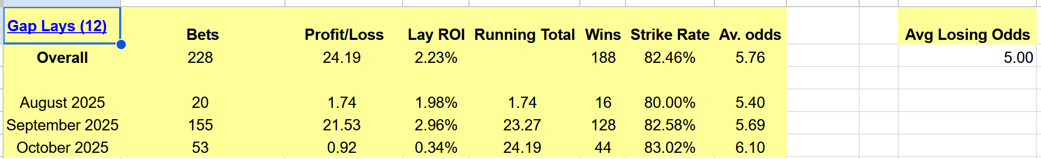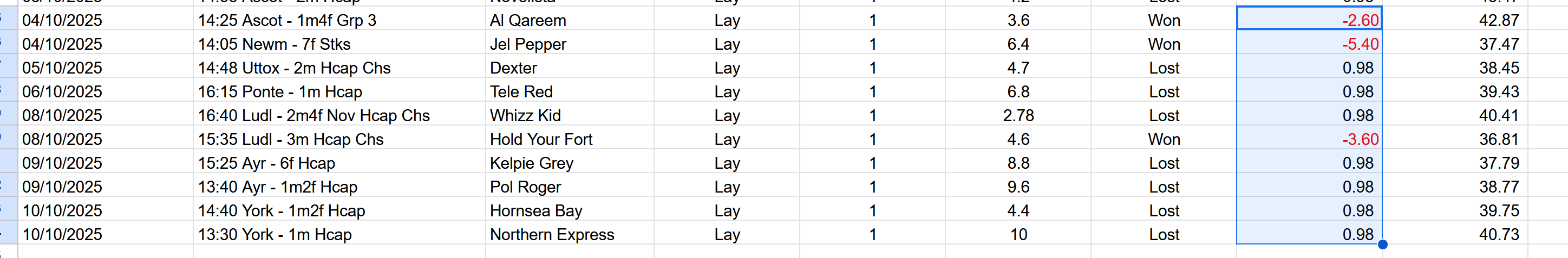 The more selective approach by looking for a bigger gap to rivals. 40 lays this week and a loss of -11.82 - interesting to see not too fewer bets and the loss very