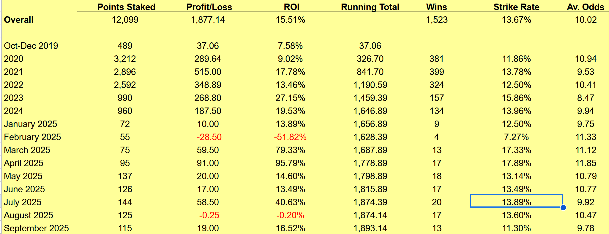 31 selections this week saw 4 winners: Someone's Wish 7/1, Oh Yes You Do 5/1, Seskin Flash 13/2, Inchidaly Copper 5/1. Sadfly not enough to turn a profit this week with -2.5 and October sits -3.5 which is
