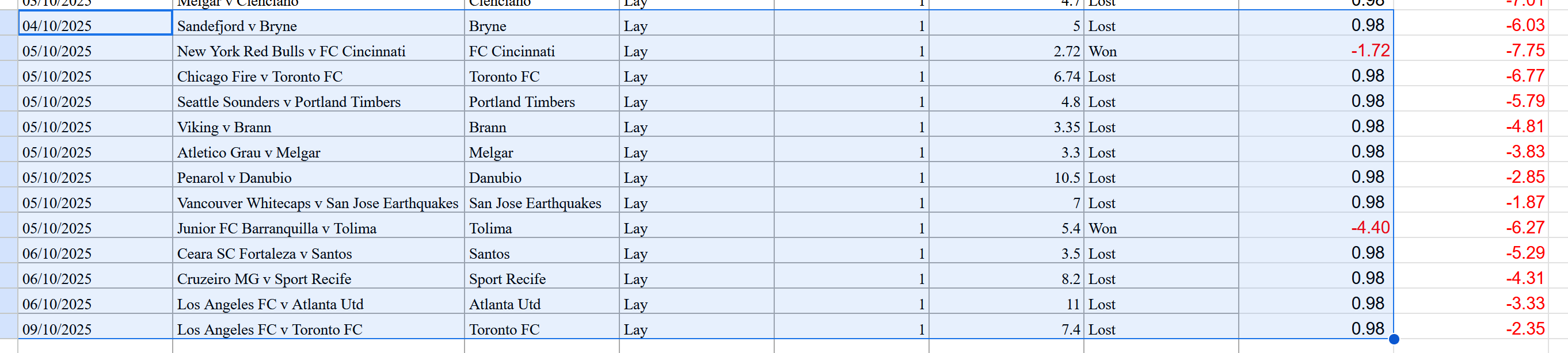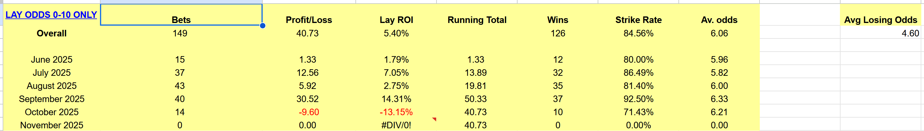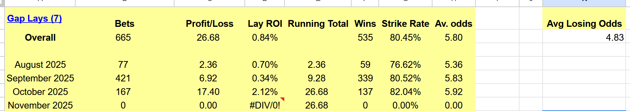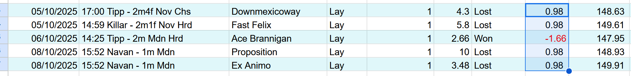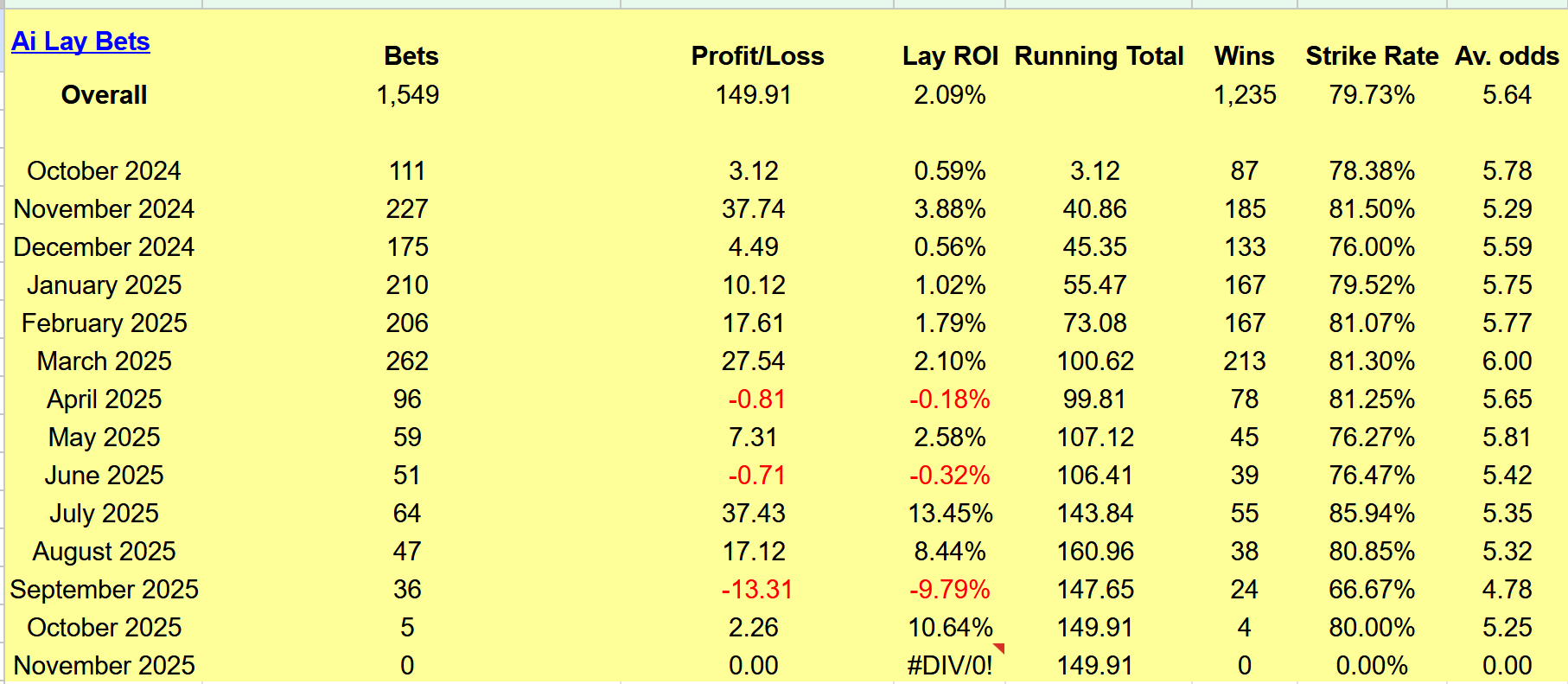 124 lays this week (would be difficult to lay all manually!) for a loss of -3. October +17 and overall +26 from 665 lays.