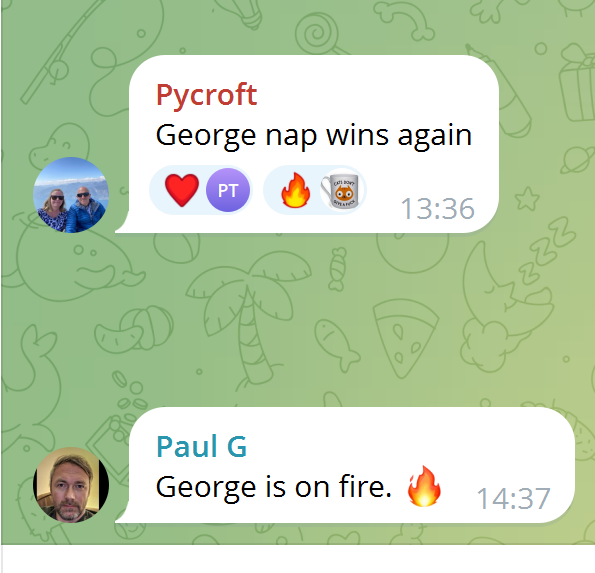 I've been asked what the plan is with George, the answer really is that's up to George.. But I would like to continue emailing the Naps in some form, be that free for a while longer or as a paid standalone service. I think it's good to offer those outside of his Telegram Channel. I would highly recommend you follow these based on results to date!
