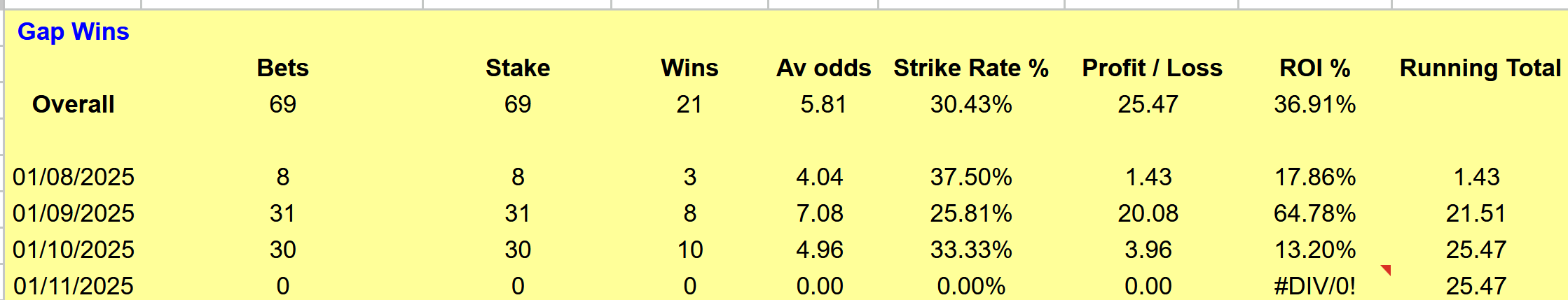 Note: I do not lay over 10.0, bets are fired automatically at 60 seconds pre race and my results are based on this only.