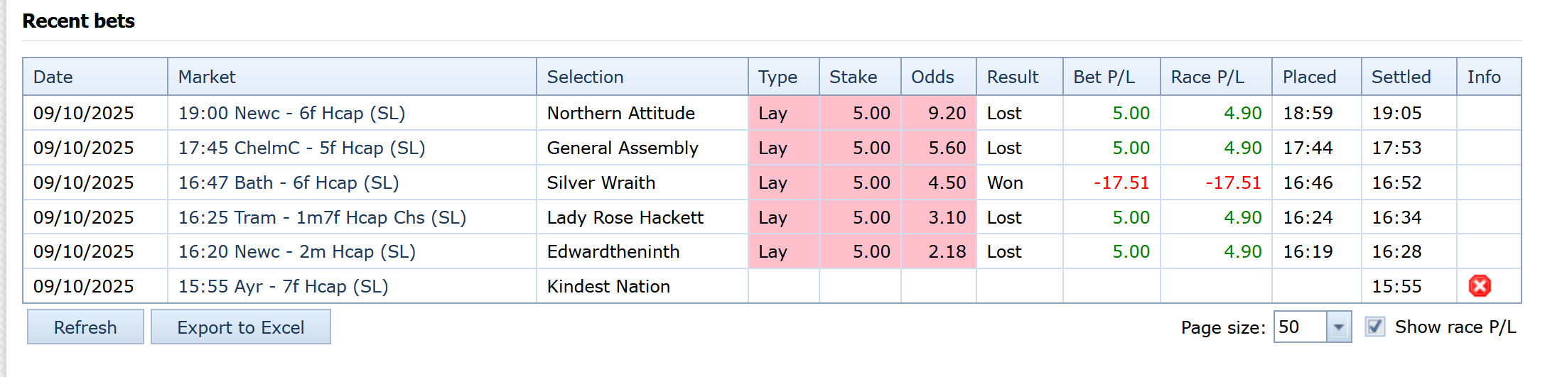 Note: I do not lay over 10.0, bets are fired automatically at 60 seconds pre race and my results are based on this only.