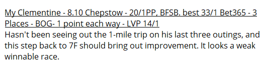 again! Friday night followers were BOUNCING again as My Clementine banged in a lovely 20/1- 25 point profit to push Hanbury racing to +99 for the month and +260 points profit or a HUGE £2,600 to £10 stakes!Â