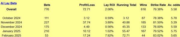 At +64 +72overall with another 10 17.2 points profit added in Nine days and 4 winning months from 4 over 735 Lays its easy to see why Ai Lays are so popular!
