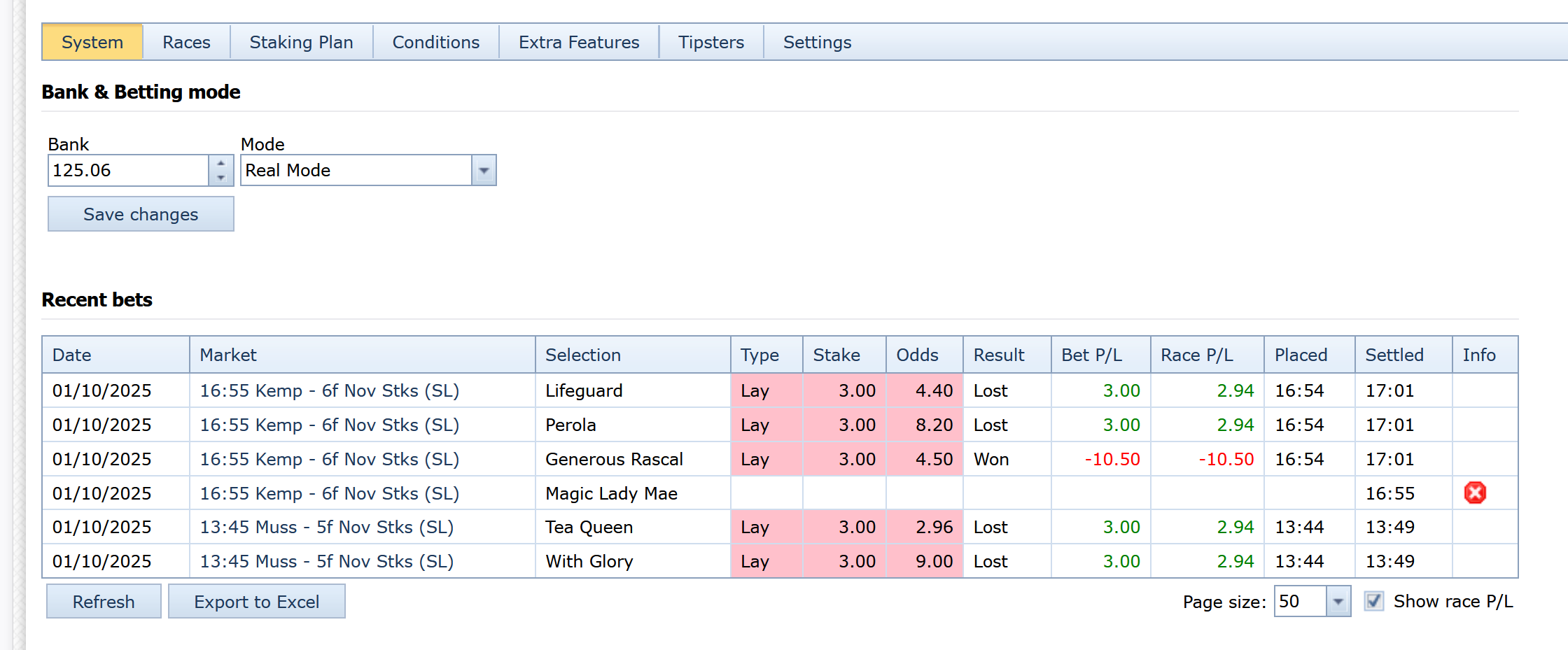 At some point I turned these to sim and that was absolutely a mistake im willing to learn from. As with lay the draw i've accounted only for the bets since I turned it back on (24th Sept). A very solid result from these only with about a weeks worth of bets. With all selections for these finishing the month on +35 I have increased my stakes to £3 as you can see in above screenshot. Keen to walk before I